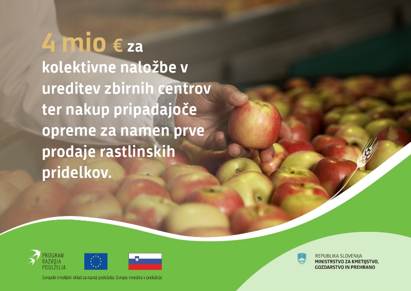 4 milijone evrov je namenjenih za kolektivne naložbe v ureditev zbirnih centrov ter nakup pripadajoče opreme za namen prve prodaje rastlinskih pridelkov.