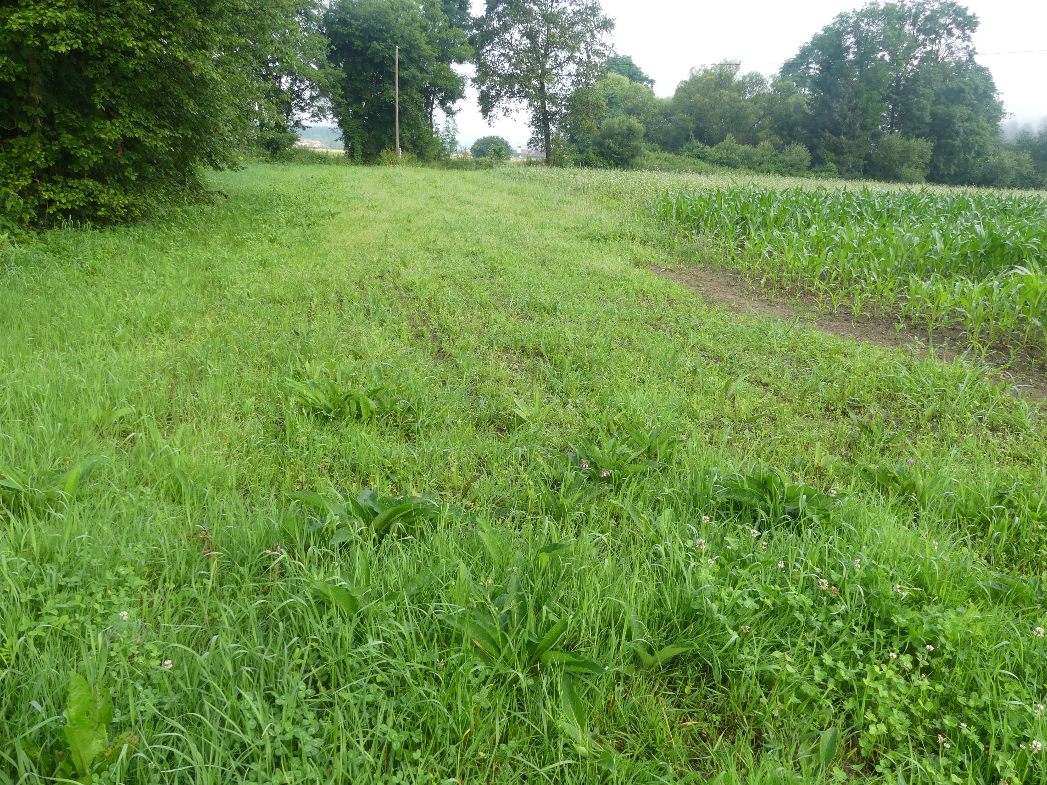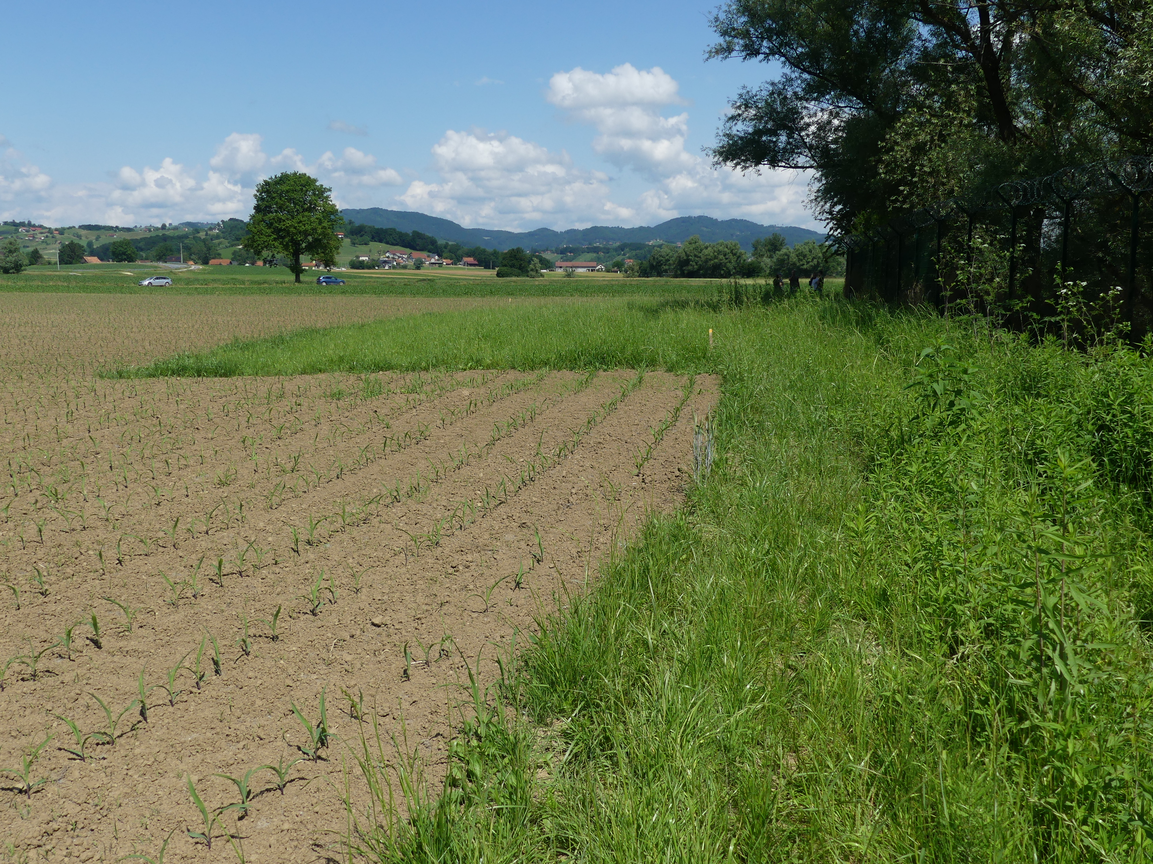 Mešanica trav in detelj v varovalnem pasu njive s koruzo in krompirjem, ob vodotoku 1. reda, 3 tedne po setvi 15. 6.