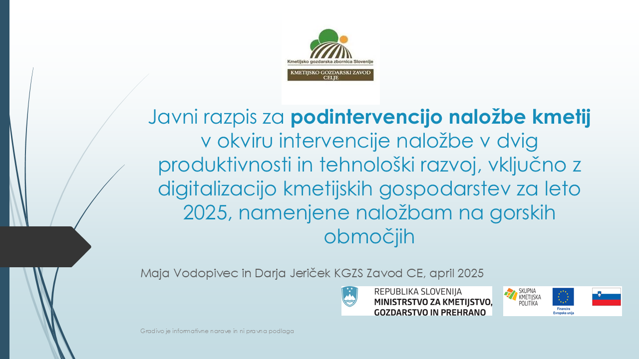 Več o razpisu najdete tukaj: https://www.gov.si/zbirke/javne-objave/javni-razpis-za-podintervencijo-nalozbe-kmetij-v-okviru-intervencije-nalozbe-v-dvig-produktivnosti-in-tehnoloski-razvoj-vkljucno-z-digitalizacijo-kmetijskih-gospodarstev-za-leto-2025-namenjene-nalozbam-na-gorskih-obmocjih/