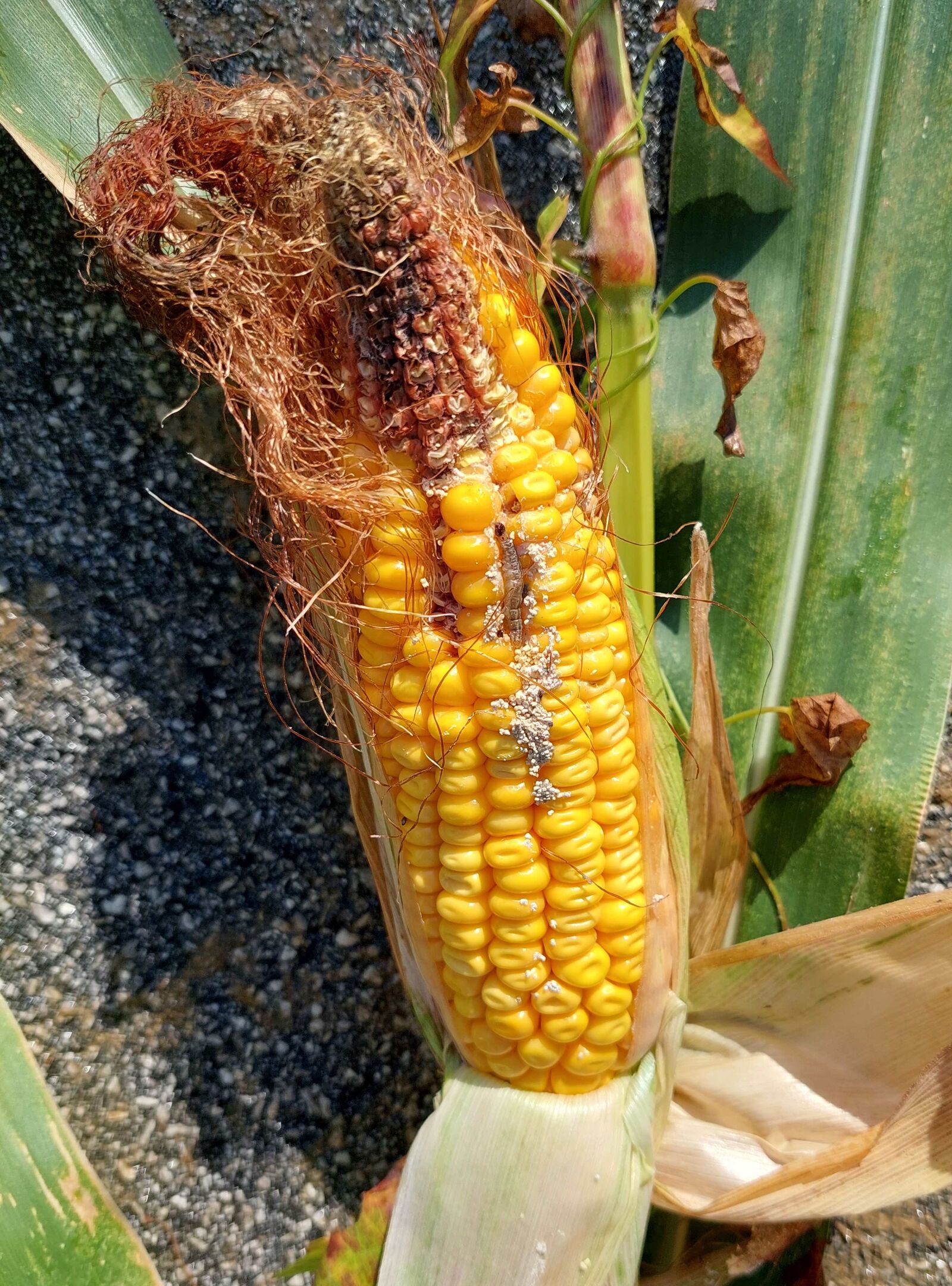 Slika 2: Gosenica koruzne vešče v storžu koruze (foto: A. Marguč Kavc)
